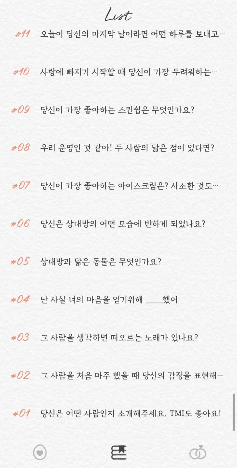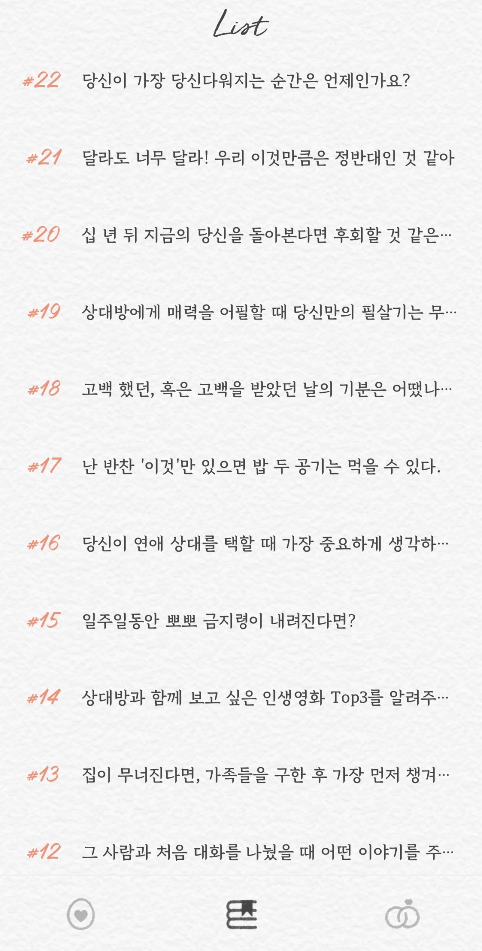썸원 질문 목록으로 인한 유입이 상당하길래 200번까지 한 번에 올리려다 일단 150번까지라도 공유해보자 싶어서 어플 속 질문들을 캡처해왔다. 곧 200번대 질문 돌파를 바라보고 있는 시점에 반��
