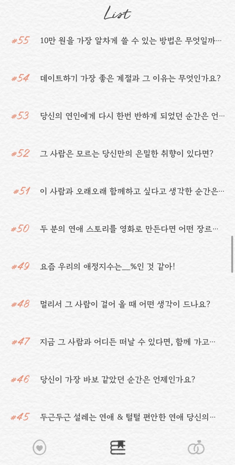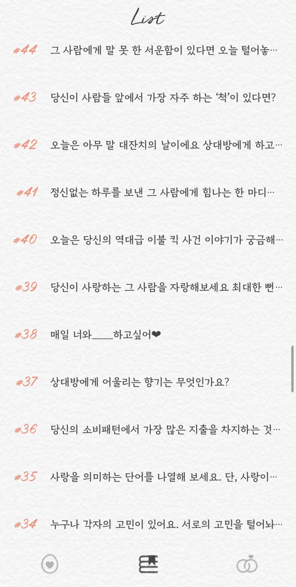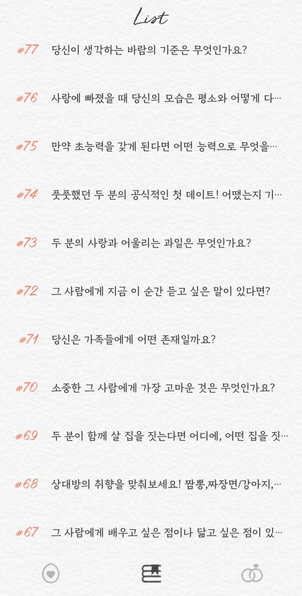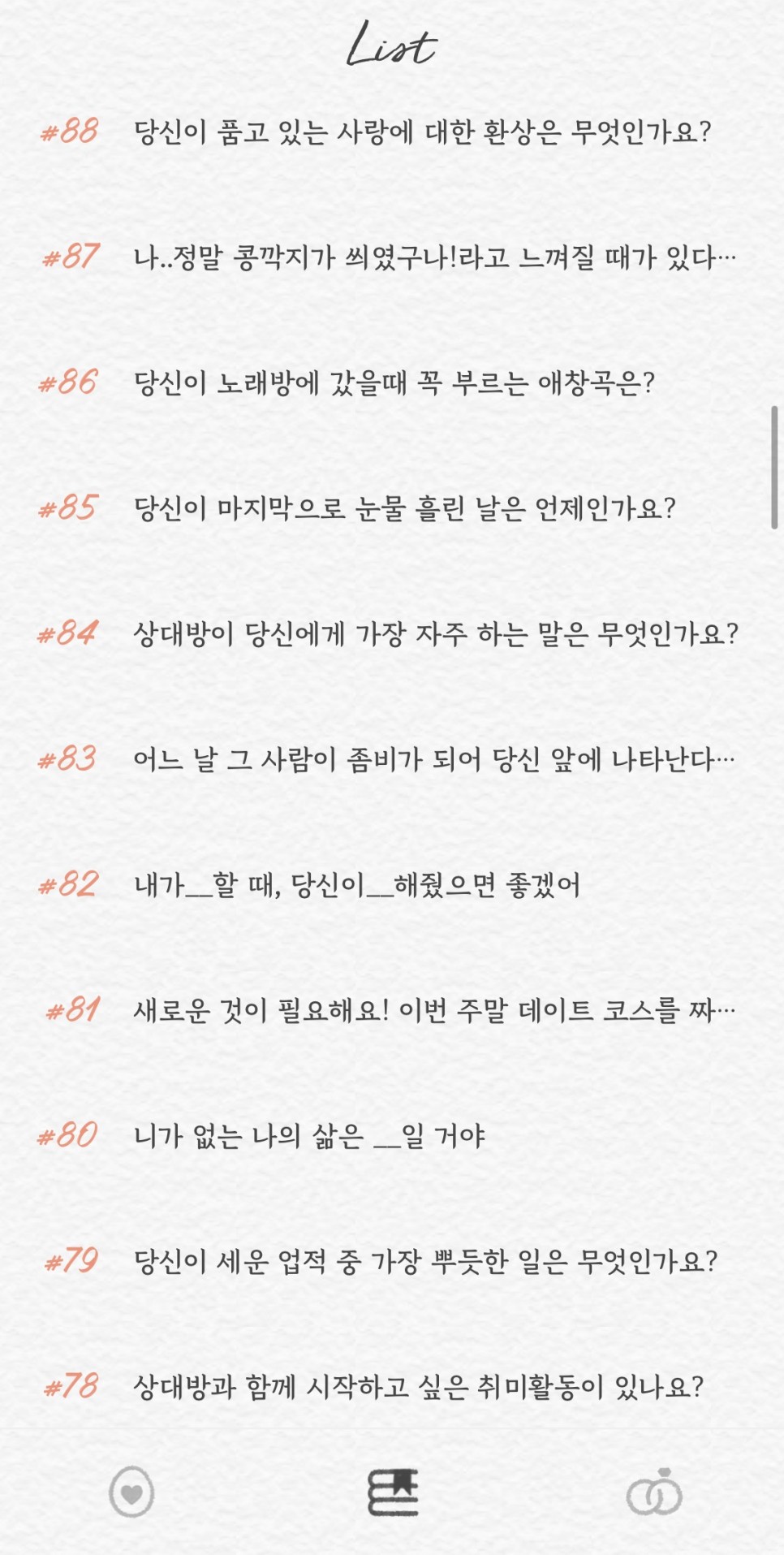 썸원 질문 100번까지는 그리 긴 질문들이 없다 보니 화면에 보이는 내용만으로도 유추할 수 있을 듯하다.